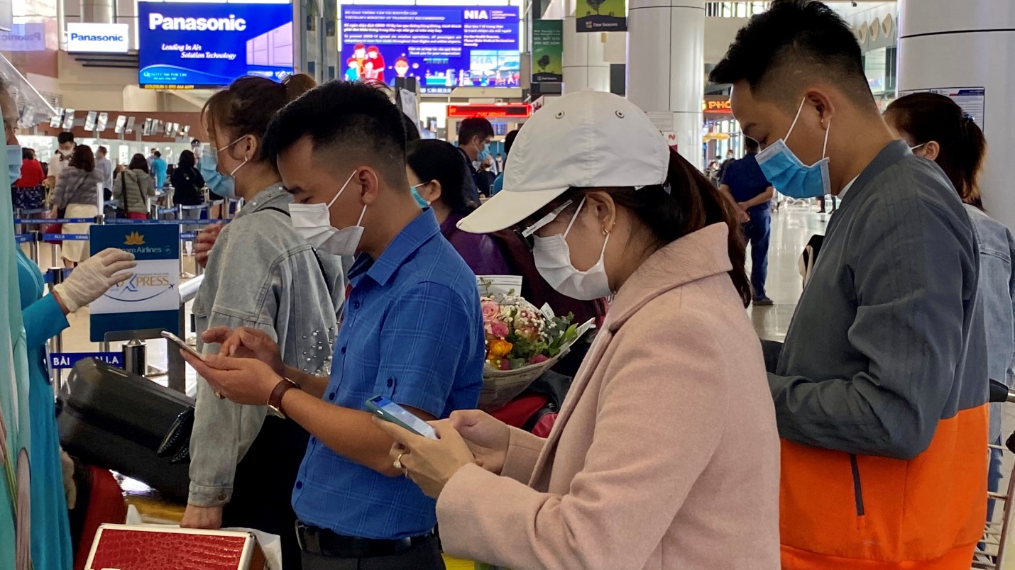 Nhiều khách đã chủ động sẵn bản chụp mã QR code của tờ khai y tế online khi xếp hàng làm thủ tục hàng không
