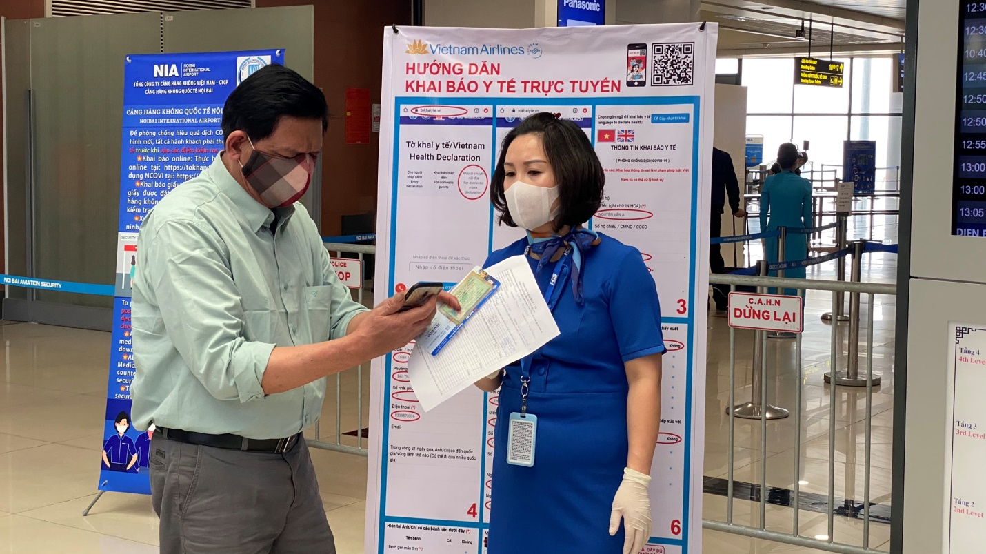 Nhân viên VietnamAirlines hỗ trợ khách khai báo y tế online