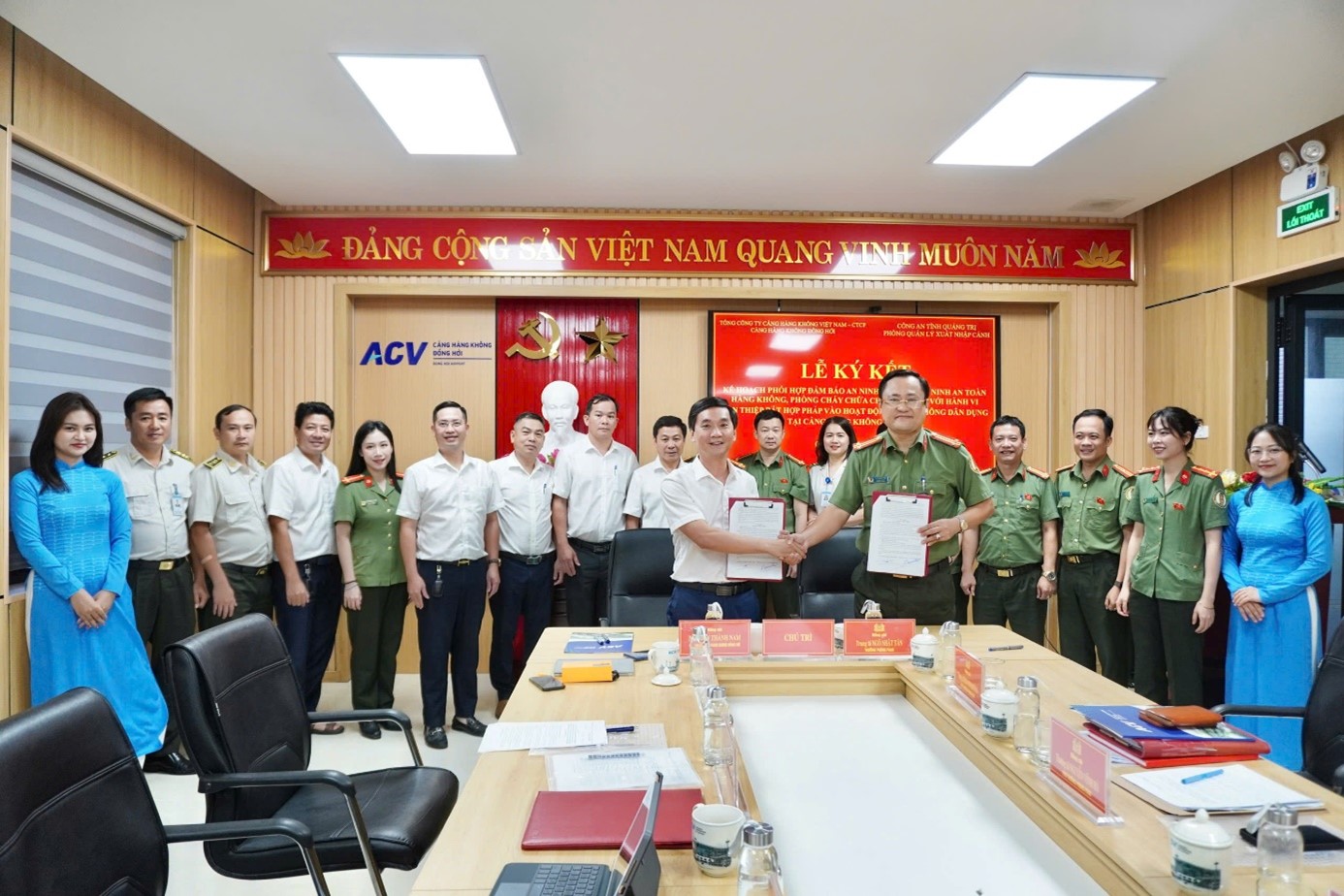 Chiều ngày 16 tháng 10 năm 2025, Cảng hàng không Đồng Hới và Phòng Quản lý Xuất nhập cảnh (PA08) – Công an tỉnh Quảng Trị đã tổ chức Lễ ký kết Kế hoạch phối hợp công tác tại hội trường Cảng hàng không Đồng Hới nhằm tăng cường hiệu quả công tác bảo đảm an ninh trật tự, an ninh – an toàn hàng không, phòng cháy chữa cháy (PCCC) và chủ động phòng ngừa, ứng phó với các hành vi can thiệp bất hợp pháp vào hoạt động hàng không dân dụng.