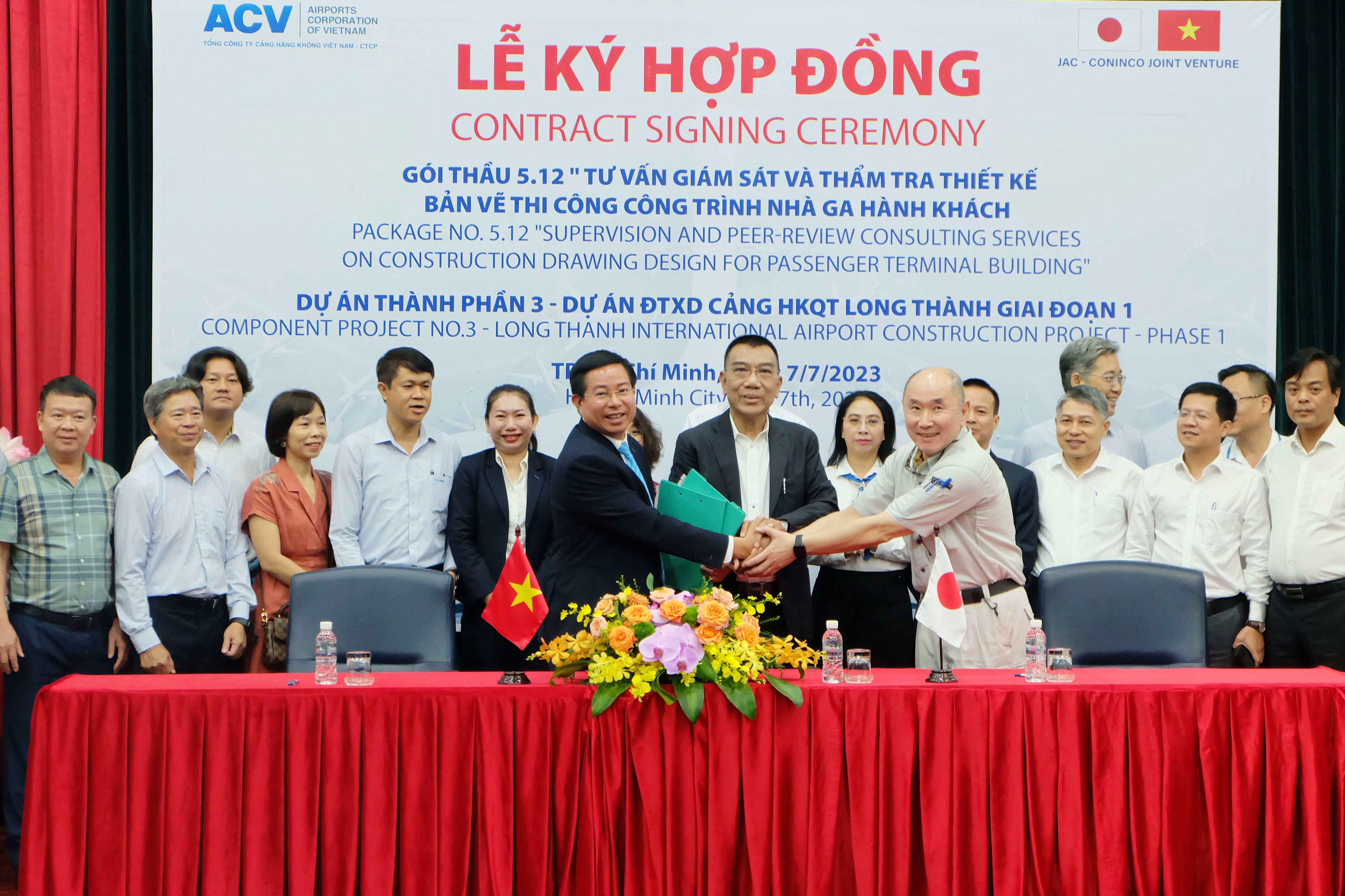 Ngày 07/7/2023, Tổng công ty Cảng hàng không Việt Nam (ACV) đã long trọng tổ chức Lễ ký kết và trao hợp đồng tư vấn gói thầu 5.12 “Tư vấn giám sát, thẩm tra thiết kế bản vẽ thi công công trình nhà ga hành khách” của dự án thành phần 3 – Các công trình thiết yếu trong Cảng hàng không thuộc dự án đầu tư xây dựng Cảng HKQT Long Thành giai đoạn 1 cho Liên danh Nhà thầu JAC – CONINCO (Japan Airport Consultants, Inc. và Công ty cổ phần tư vấn công nghệ, thiết bị và kiểm định xây dựng – CONINCO). Tham dự buổi lễ có Ông Lại Xuân Thanh - Chủ tịch HĐQT ACV; Ông Ryohei Yamada - Giám đốc điều hành, Tổng Giám đốc Ban Thương mại Quốc tế JAC; Ông Nguyễn Văn Công - Chủ tịch HĐQT CONINCO cùng các thành viên HĐQT ACV, Lãnh đạo ACV, Lãnh đạo Ban QLDA Cảng HKQT Long Thành, Lãnh đạo các thành viên trong Liên danh JAC-CONINCO.