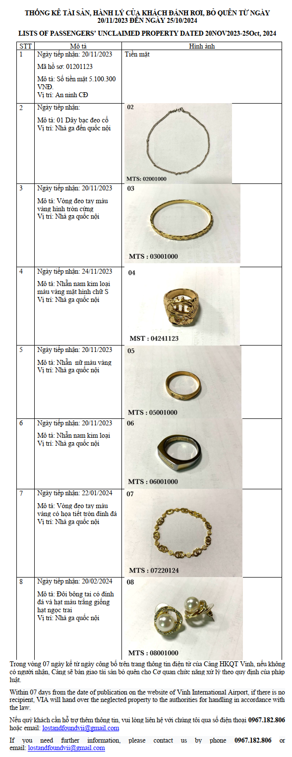 THỐNG KÊ TÀI SẢN, HÀNH LÝ CỦA KHÁCH ĐÁNH RƠI, BỎ QUÊN TỪ NGÀY 20/11/2023 ĐẾN NGÀY 25/10/2024